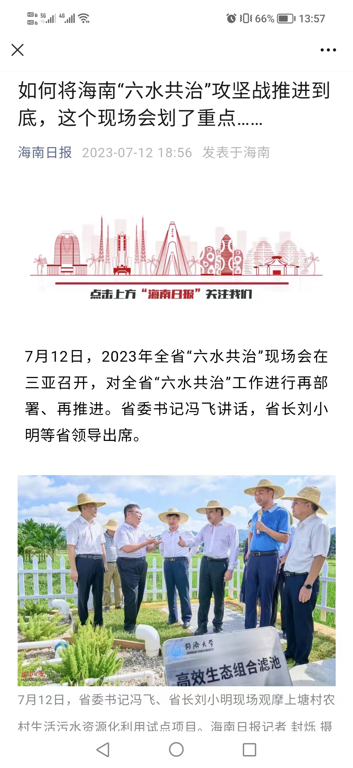 2022年初,海南省委、省政府启动了“六水共治”行动计划,中国工程院院士徐祖信受聘为“六水共治”技术总师,在三亚市建设了农村生活污水资源化利用示范样板工程,引领农污治理生态化、资源化、标准化,并实现低成本建设和运维,为海南全省农村生活污水治理提供了可复制、可推广、可借鉴的综合解决方案。我司作为实施单位参与项目实施。