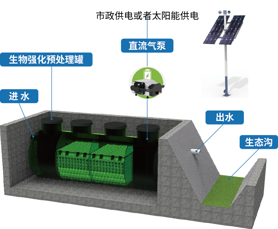 强化预处理罐(微动力): 适用于联户/连片资源化利用 包含隔渣与沉淀区、生化区、清水区三级池体,污水经预处理罐处理后进入清水区,通过提升泵将清水提升输送至资源化利用受纳体。 适用条件: 服务常住人口:6户~114人;处理规模3吨、5吨、8吨三个规模。 现场条件:受纳体地势平坦或较高,处理出水无法自流进入受纳体利用,需要提升后接入受纳体。 特点:1、占地小、埋深浅、选址灵活;2、微动力间歇好氧生物强化技术;3、出水不黑不臭,农民易于接受入园。 | ![]() |